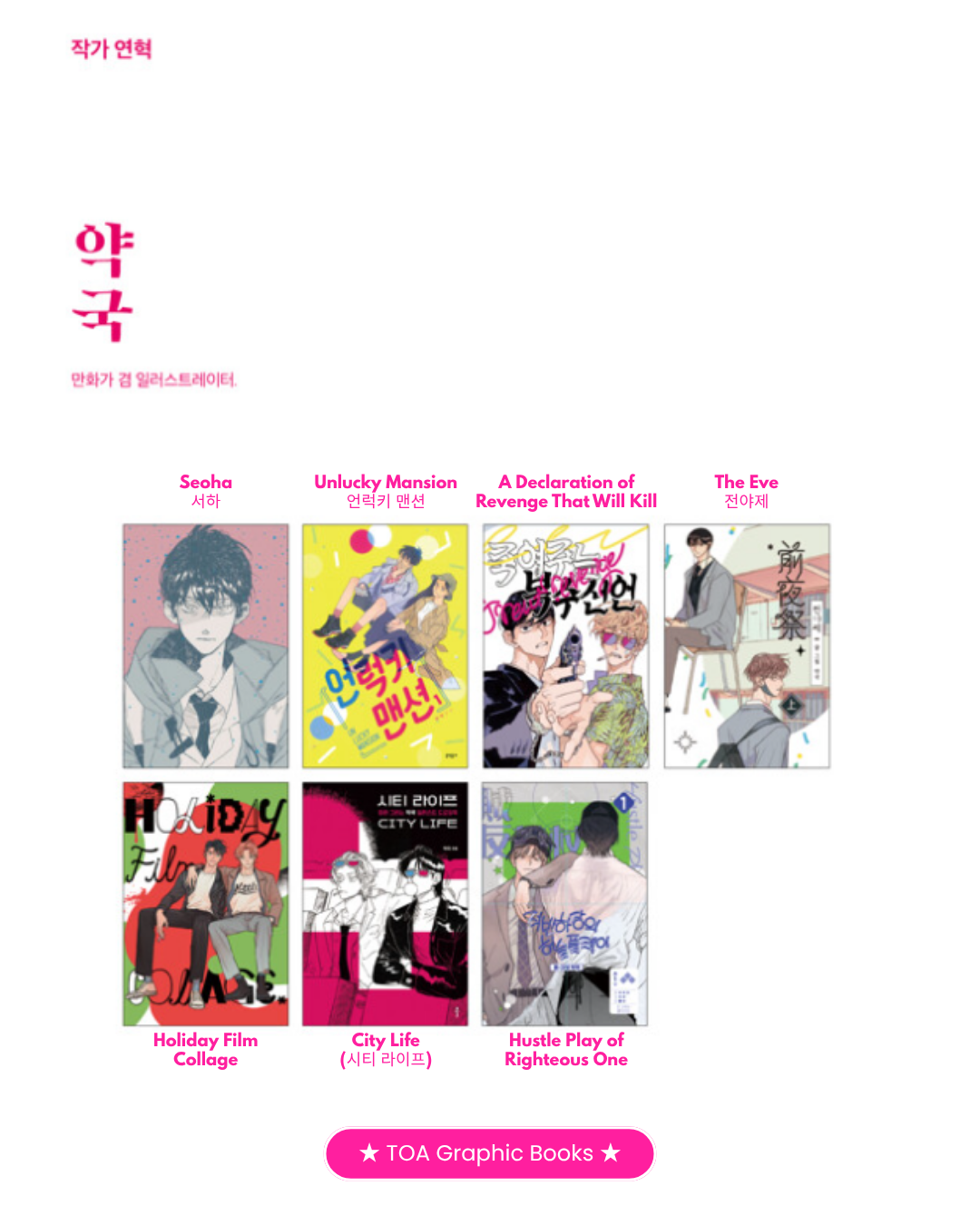<Bad Pharmacy> , <Lime & Reason #1: Dystopia> , <City Life> <The Eve 전야제> <Seoha 서하> <Unlucky Mansion 언럭키 맨션>