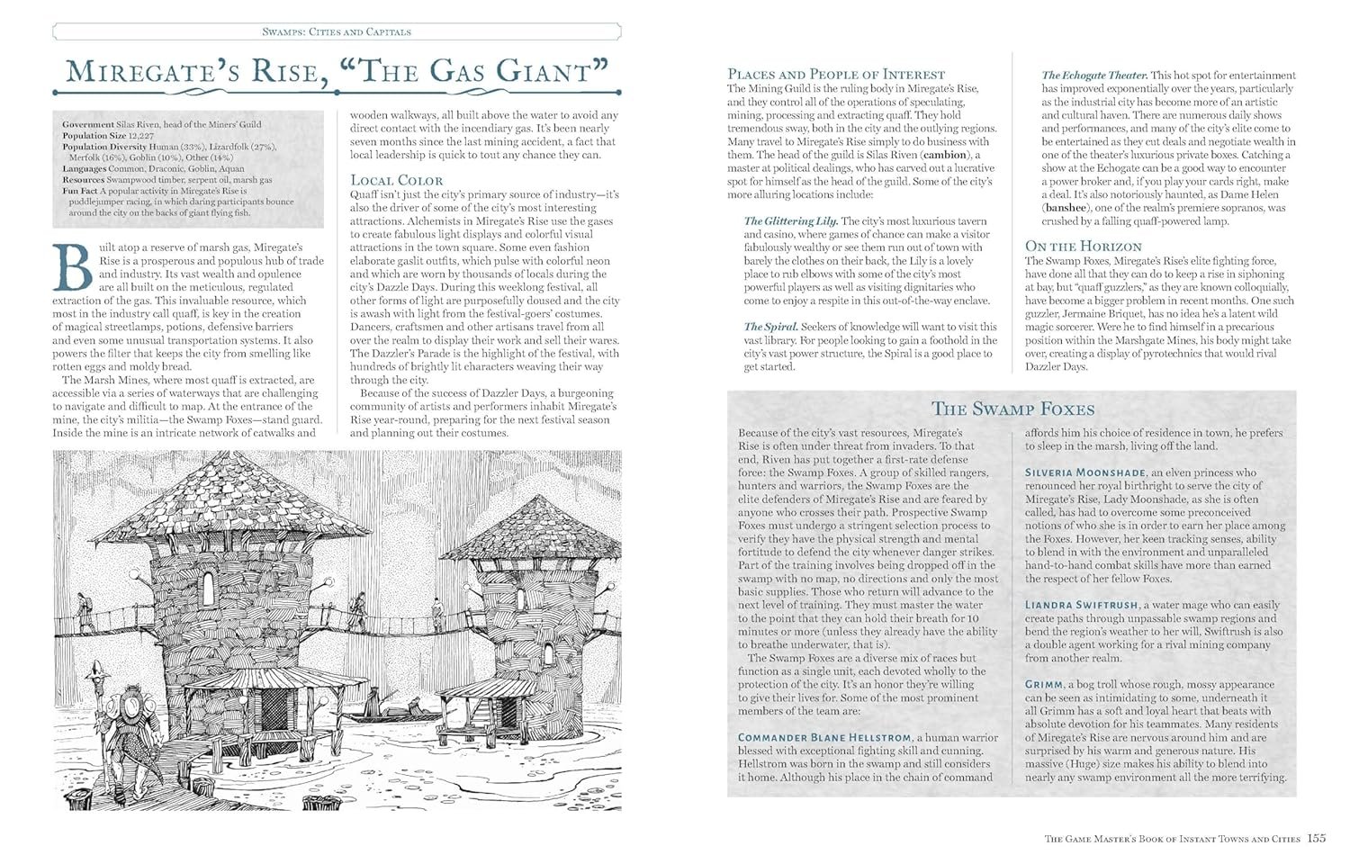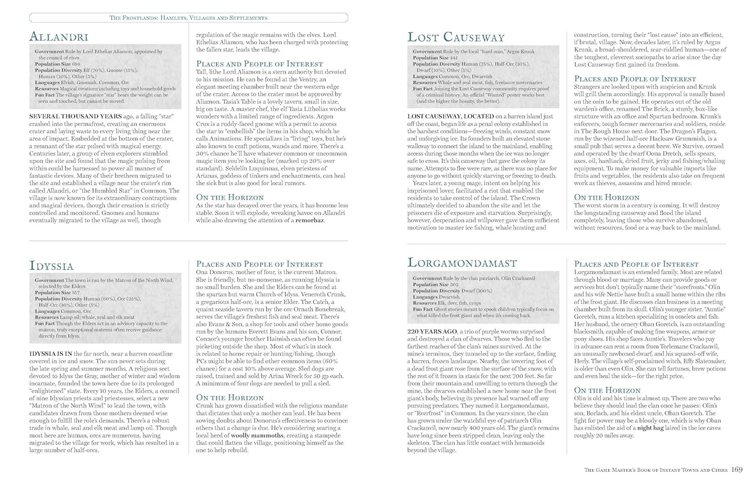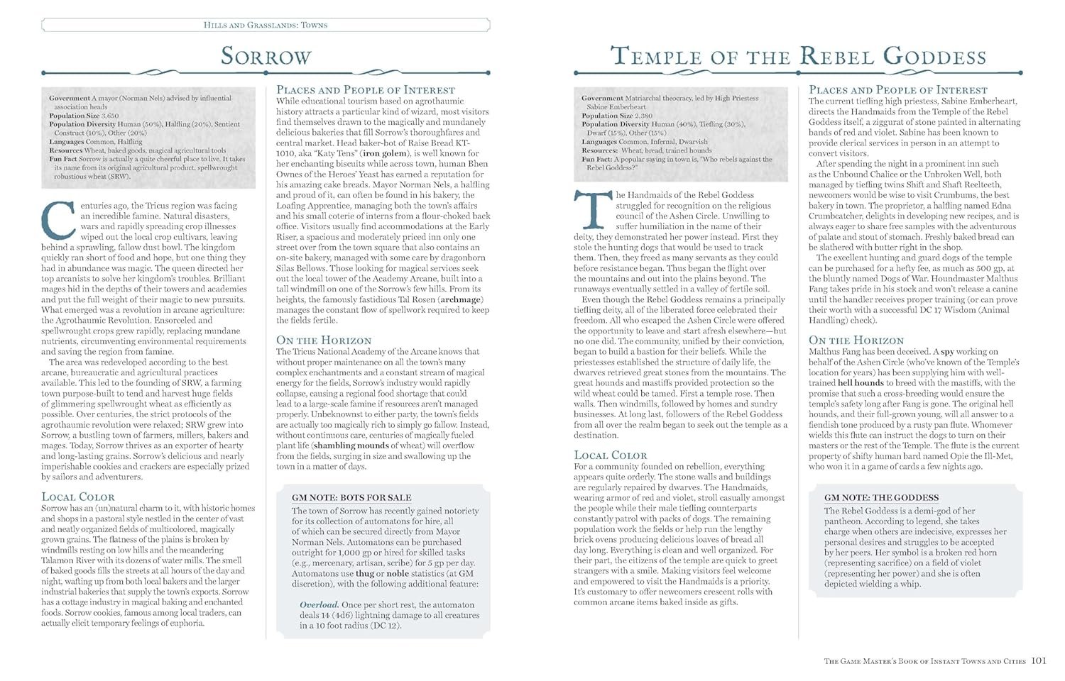 Intinya, buku ini mirip dengan Game Master’s Book of Non-Player Characters yang laris itu. Bedanya, kalau buku tersebut fokus ke karakter, Instant Towns and Villages menyajikan gambaran pusat-pusat kota yang bisa langsung dipakai sebagai solusi dadakan (misalnya saat karakter butuh tabib secepatnya dan menuju kota terdekat yang belum pernah kamu rancang), atau bahkan jadi ide awal untuk satu arc petualangan penuh—tergantung kebutuhan party atau GM.
