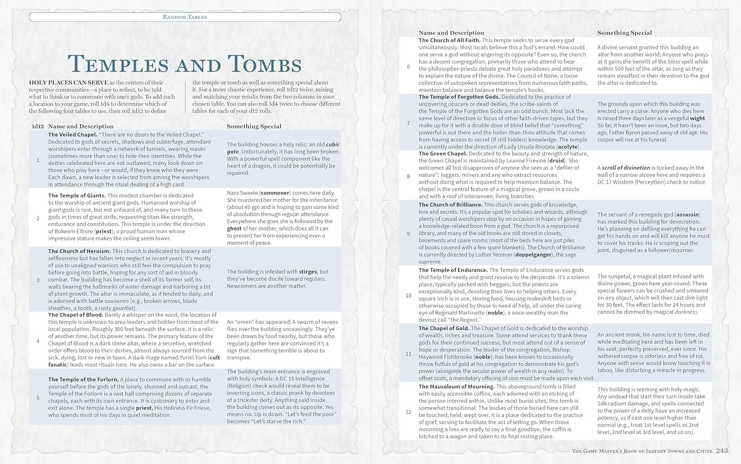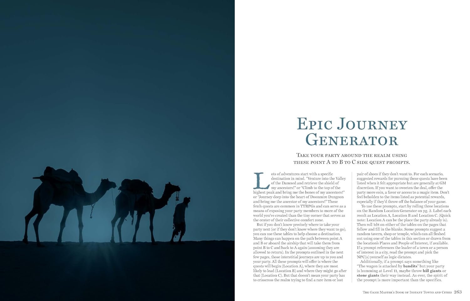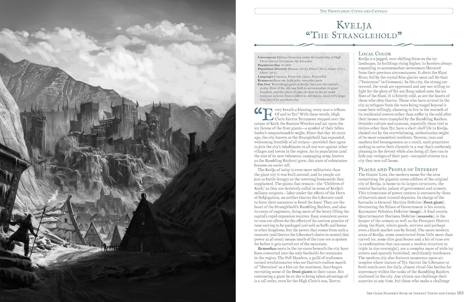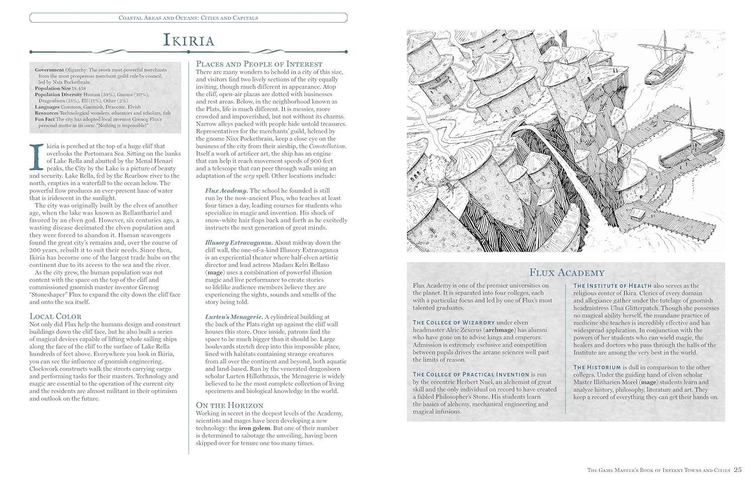 Intinya, buku ini mirip dengan Game Master’s Book of Non-Player Characters yang laris itu. Bedanya, kalau buku tersebut fokus ke karakter, Instant Towns and Villages menyajikan gambaran pusat-pusat kota yang bisa langsung dipakai sebagai solusi dadakan (misalnya saat karakter butuh tabib secepatnya dan menuju kota terdekat yang belum pernah kamu rancang), atau bahkan jadi ide awal untuk satu arc petualangan penuh—tergantung kebutuhan party atau GM.