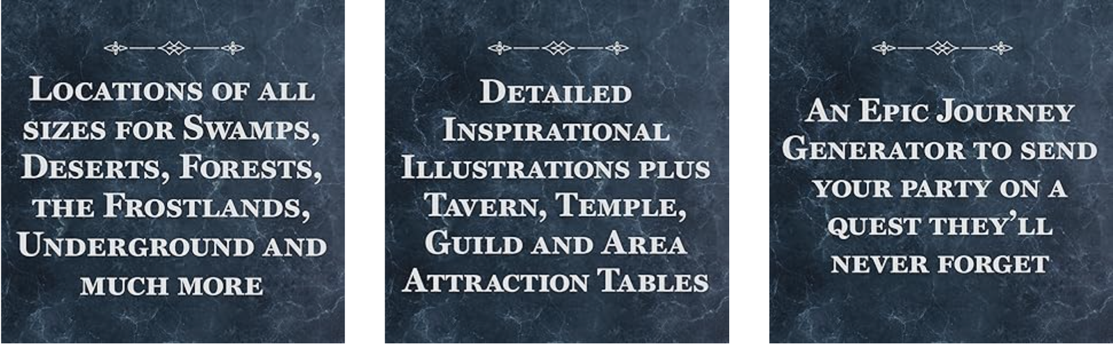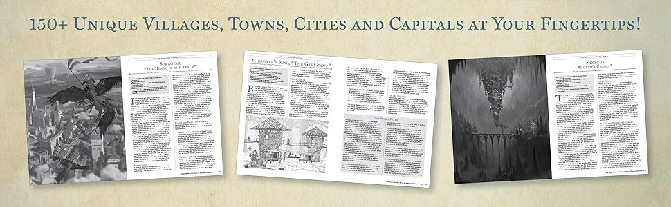Koleksi “penyelamat game” ini berisi hampir 170 lokasi siap pakai, disusun berdasarkan lingkungan dan dibagi menjadi desa, kota kecil, kota besar, hingga ibu kota. Jadi ketika party kamu lagi nyasar di rawa berbahaya, gurun yang kejam, atau garis pantai yang dihantam badai dan butuh tempat berlindung, mereka bisa langsung menemukan pemukiman lengkap—entah itu desa biasa, enclave elf, atau kamp tambang dwarf—tanpa GM harus nyiapin apa pun sebelumnya.